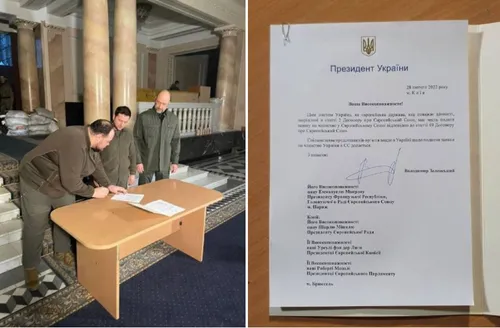 Objavljena je i fotografija iz, vjerovatno, predsjedničke palate na kojoj Zelenskij potpisuje zahtjev za članstvo.