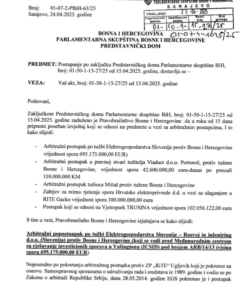 Na zahtjev Predstavničkog doma Parlamentarne skupštine Bosne i Hercegovine, državno Pravobranilaštvo je sačinilo izvještaj o trenutnim arbitražnim postupcima koji se vode protiv BiH, a koji će biti razmatran na sjednici zakazanoj za četvrtak 15. maja.