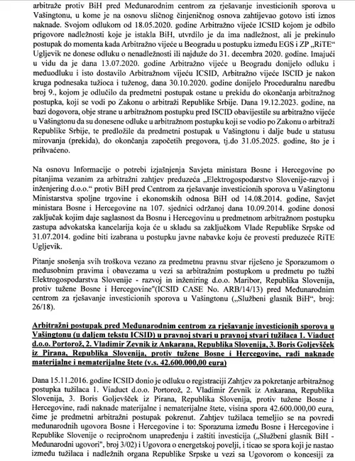 Arbitražni postupak po tužbi Elektrogospodarstva Slovenije protiv BiH vodi se pred ICSID-om u Washingtonu, pod oznakom ARB/14/13, a vrijednost spora iznosi 695.175.000 eura.