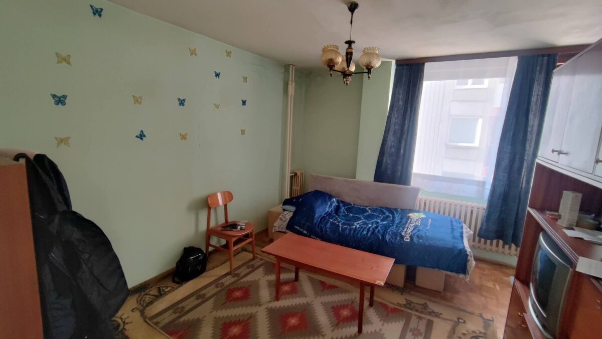 Fotografije iz oglasa prikazuju skromno uređen stan starijeg tipa, sa starim kupatilom, malom kuhinjom i dnevnim prostorom koji ujedno služi i kao spavaća soba.