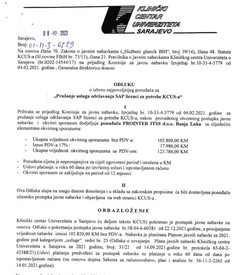 "Budući da je zadovoljena transparentnost i da je cijena prihvatljive ponude za "Pružanje usluga održavanja SAP licenci za potrebe KCUS-a" u okviru osiguranih sredstava za nabavku, Komisija je dala prijedlog da se donese odluka o lzboru najpovoljnijeg ponuđača i okvirni sporazum dodijeli PROINTER ITSS d.o.o. Banjaluka".