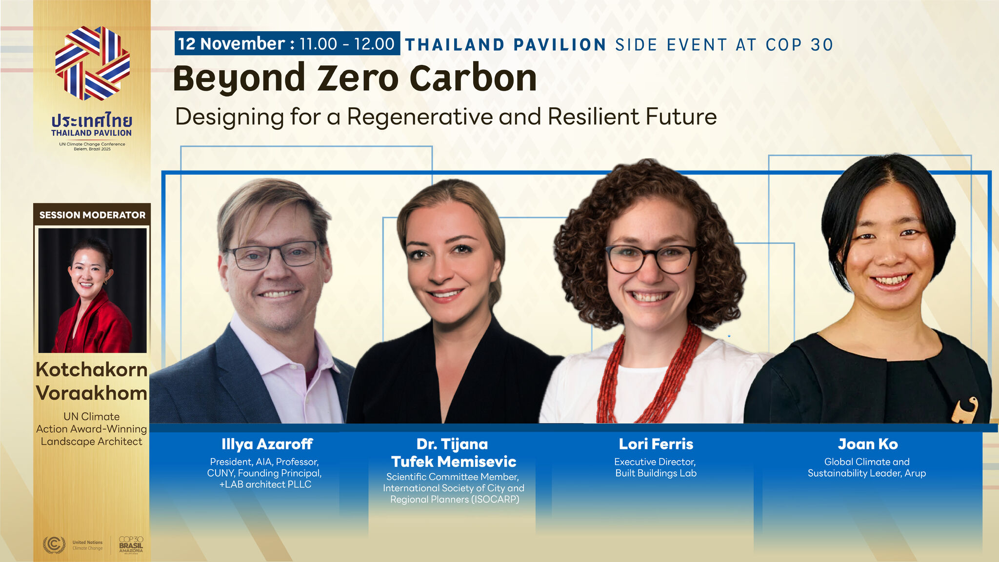Na panelu koji je vodila svjetski poznata i nagradjivana pejzazna arhitektica Kotchakorn Voraakhom, ucestvovala sam kao predstavnik urbanista i glas struke. Zajedno sa predsjednikom Američkog instituta arhitekata i drugim predstavnicima iz sektora izgrađenog okruženja govorila sam o tome zašto i kako se naše struke moraju ujediniti oko procesa implementacije. Brazil je ove godine snažno promovirao koncept Mutirãa, koji označava zajednički rad i napor svih u društvu na ostvarenju jednog cilja. Taj koncept mozemo povezati i sa našom bosanskom Mobom, starim običajem zajedničkog rada za dobrobit zajednice. Upravo taj duh solidarnosti i zajedničke odgovornosti je ono što nedostaje globalnoj klimatskoj politici. Vrijeme je za Mutirao izgrađenog okruženja.