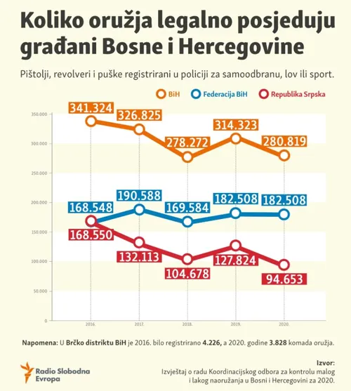 Zanimljivo, 2016. godine dva bh. entiteta imala su skoro identičan broj registrovanog oružja. Federacija je te godine imala 168.548 komada, a Republika Srpska 168.550.
