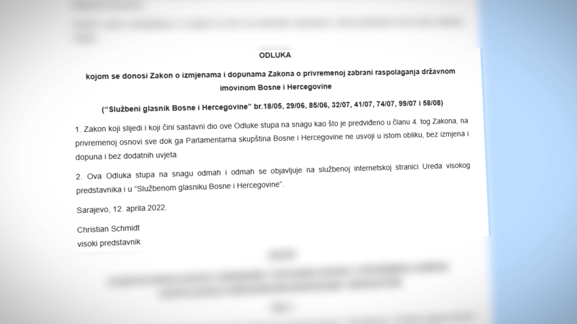 U dopunama ovog zakona kojeg je nedavno nametnuo Kristijan Šmit navedeno je kako drzavnom imovinom isključivo može raspolagati država BiH do donošenja zakona na državnm nivou.