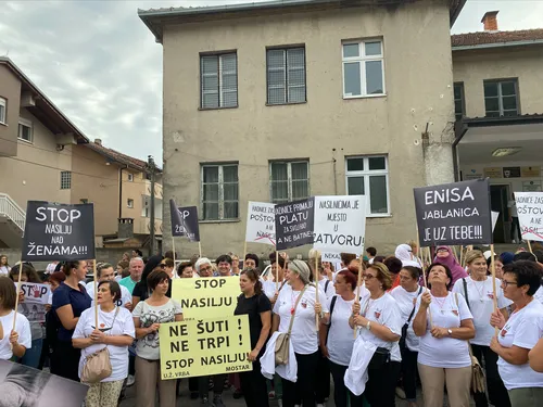 "Nasilnici moraju snositi posljedice", "Nasilnicima je mjesto u zatvoru", "Enisa, Jablanica je uz tebe", "Nema opravdanja za nasilje nad ženama" - samo su neke od poruka koje na transparentima drže žene.