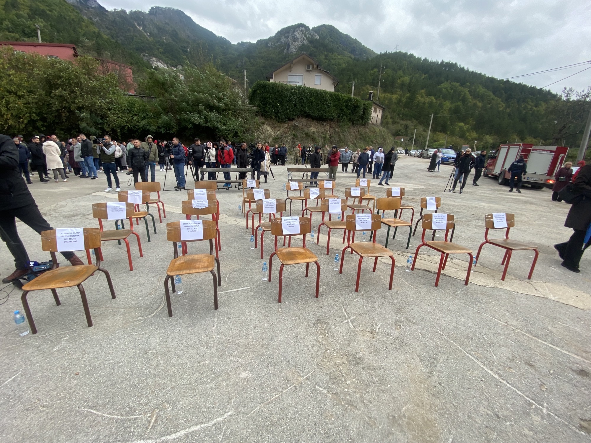Redovi praznih stolica s natpisima rezervisanim za institucije i političke predstavnike stoje kao nijemi simbol odsutnosti onih koji su trebali biti uz narod.